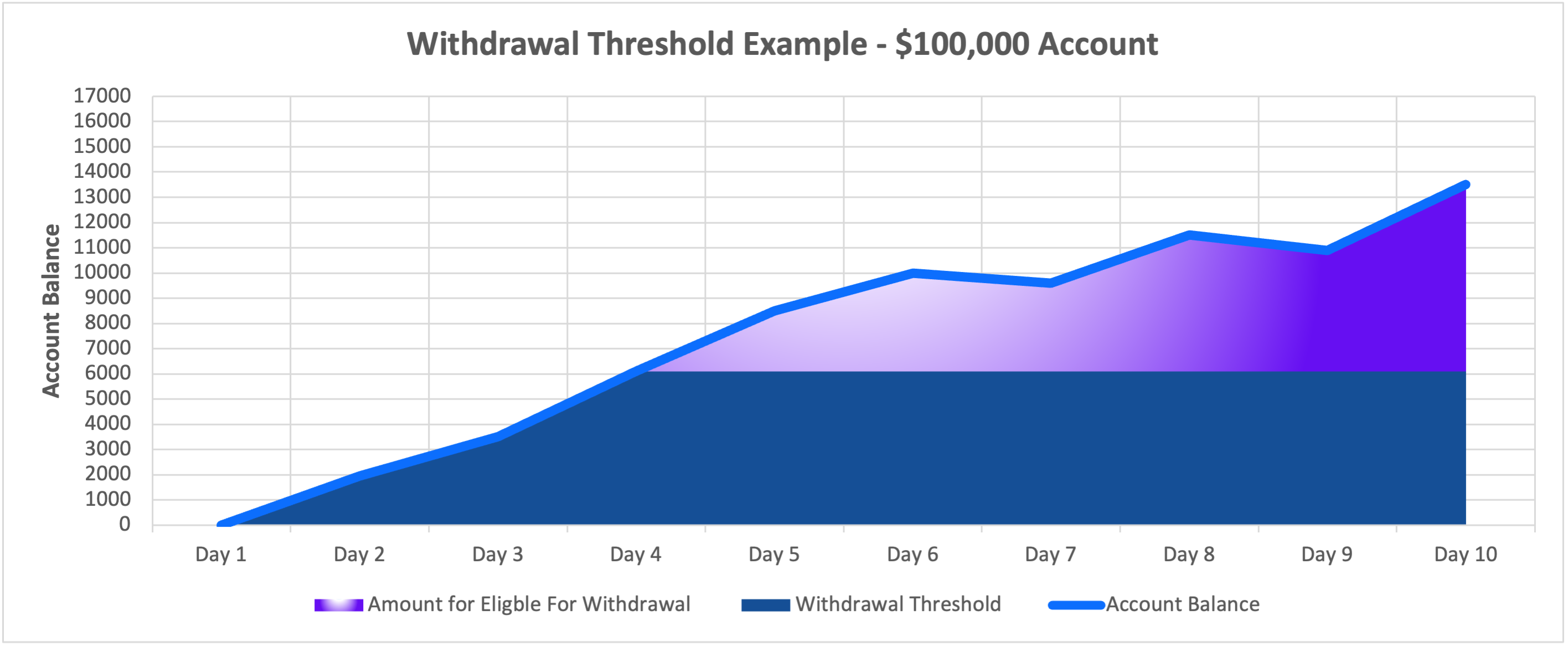 On the 6th day, the trader earns $9,000 in profits, bringing the account balance to $109,000. As the withdrawal threshold for an account of this size is $6,000, the trader becomes eligible for a withdrawal of $3,000.